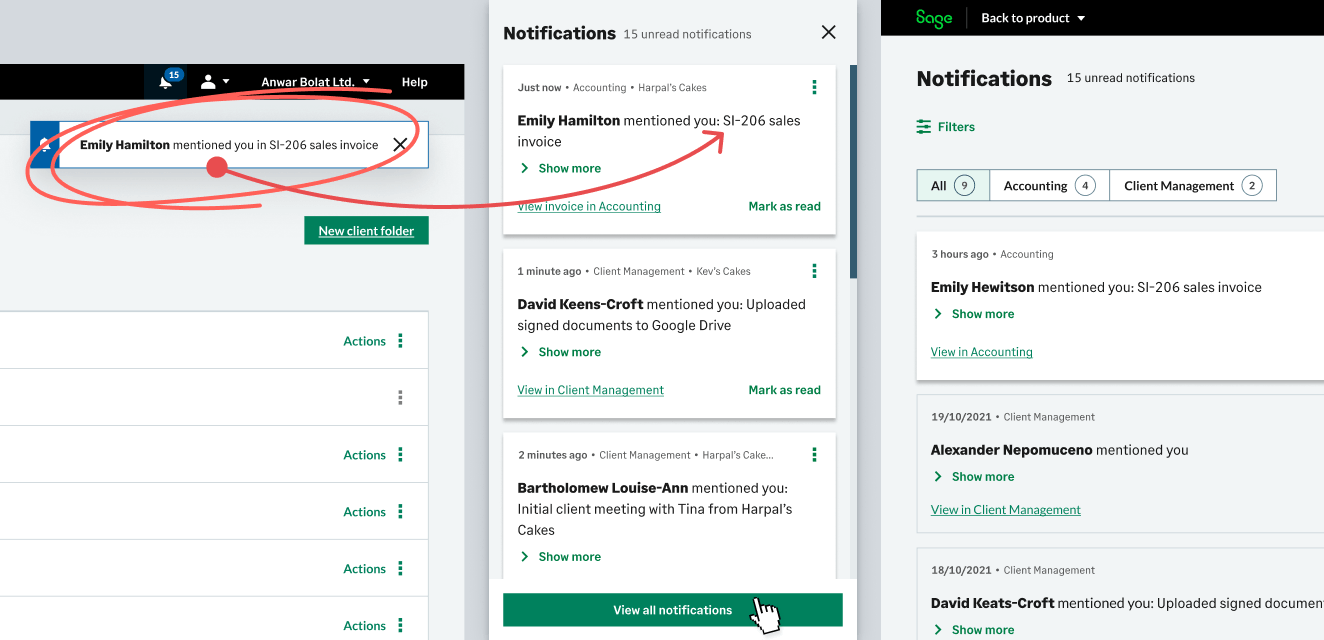 I designed a unified notification experience across all Sage products such as Accounting, HR, and Payroll to centralise alerts, messages, and system events in one place.