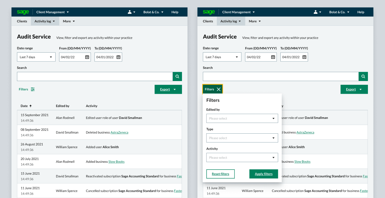 I designed the end-to-end user experience for the Audit Log service, enabling administrators to view and track user activity across Sage Business Cloud products in a secure and transparent way.